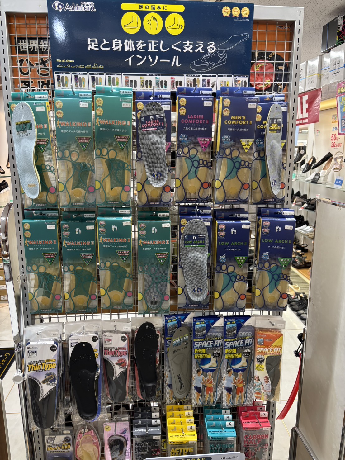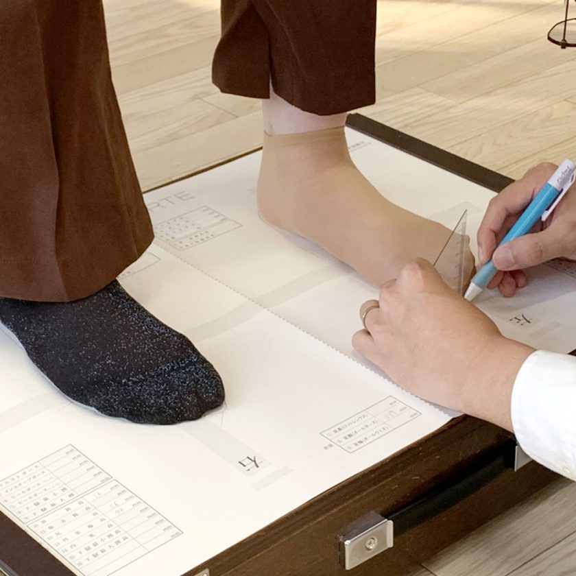 スタッフが在籍しており、足部の11カ所のサイズを測り、中敷きやパッドなどを用いて、